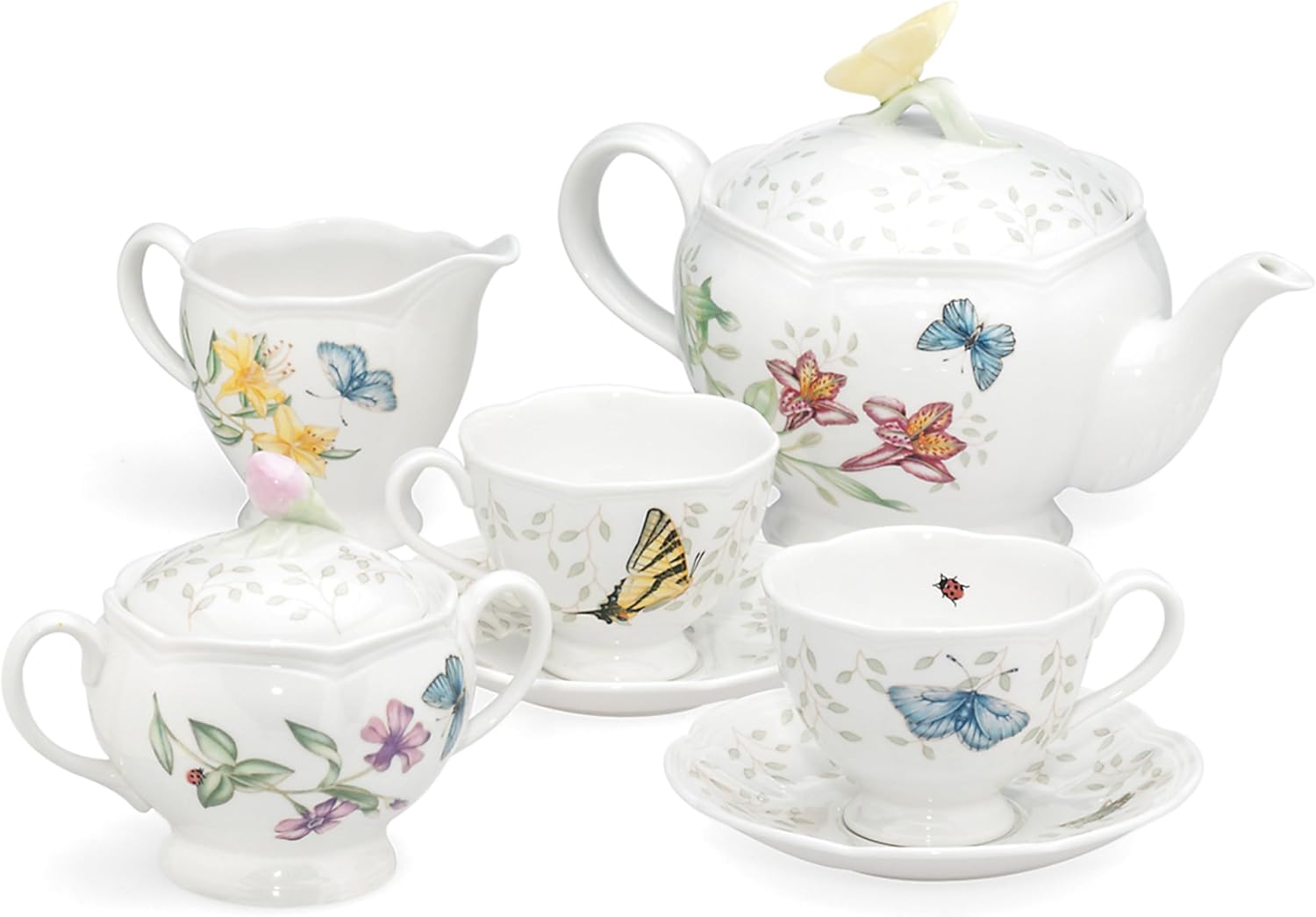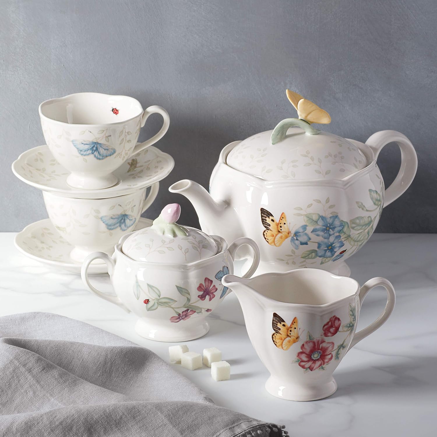- WHY IT'S SPECIAL: Lenox Butterfly Meadow tea set features a lively assortment of butterflies, ladybugs, and vibrant blooming flowers. With scalloped rims this kitchen classic adds elegance to every sip, making it ideal for everyday tea time