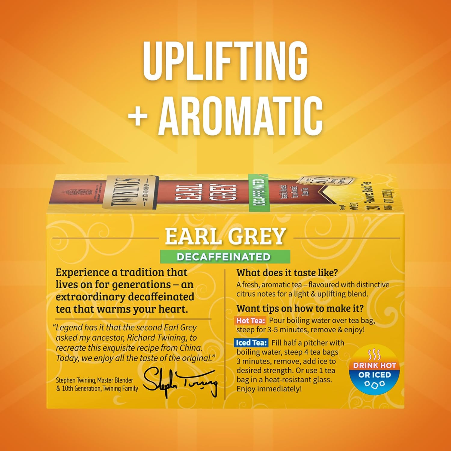 Twinings Decaffeinated Earl Grey Black Tea Individually Wrapped Bags, 20 Count (Pack of 6), Flavoured with Citrus and Bergamot, Enjoy Hot or Iced, 120 Teabags
