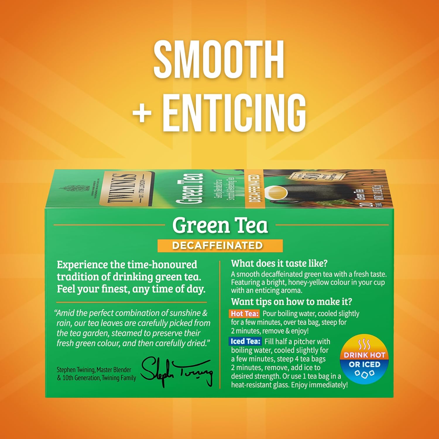 Twinings Decaffeinated Green Tea Individually Wrapped Bags, 20 Count (Pack of 1), Smooth Flavour, Enticing Aroma, Enjoy Hot or Iced, 20 Teabags