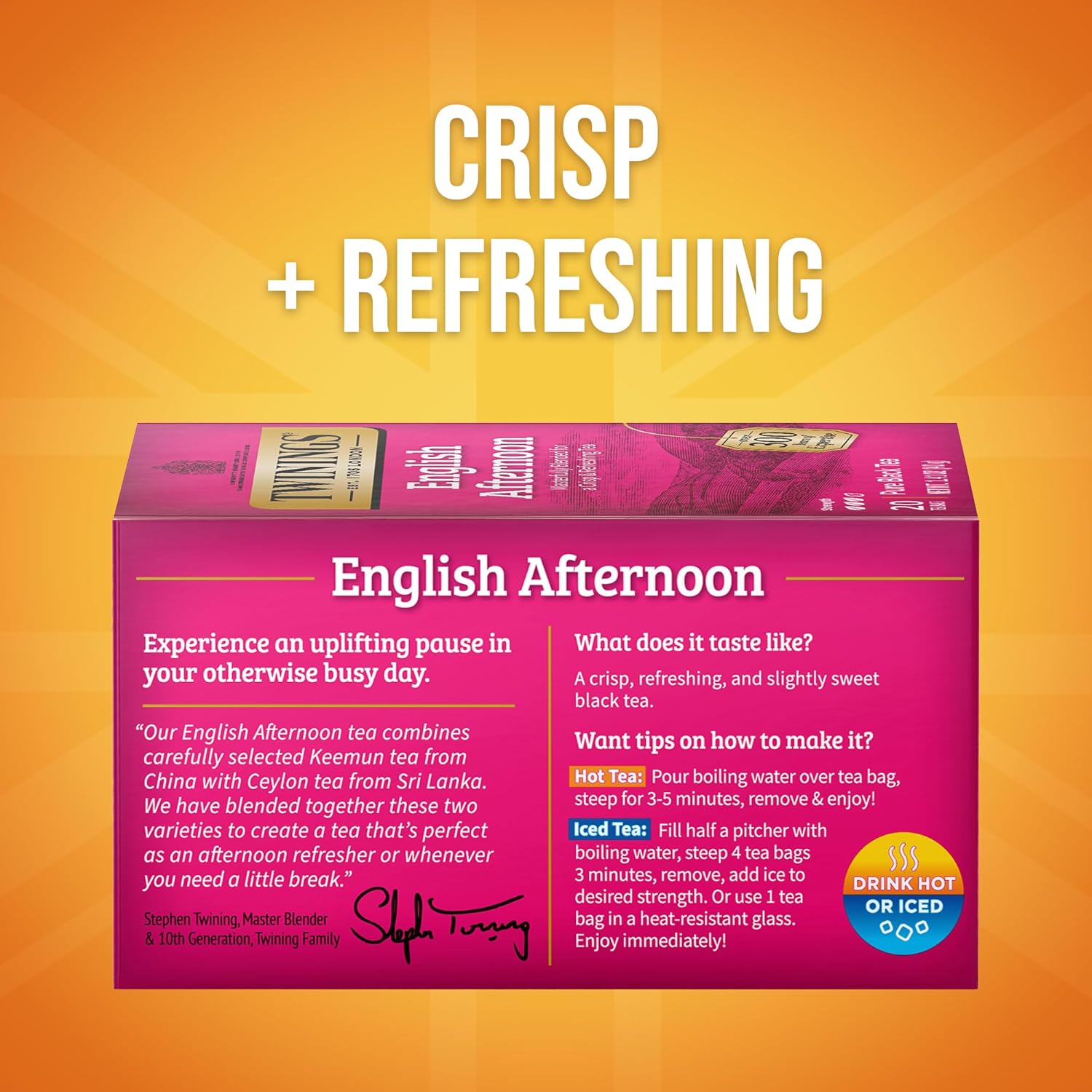 Twinings English Afternoon Black Tea Individually Wrapped Bags, 20 Count (Pack of 1), Smooth & Slightly Sweet, Caffeinated, Enjoy Hot or Iced, 20 Teabags