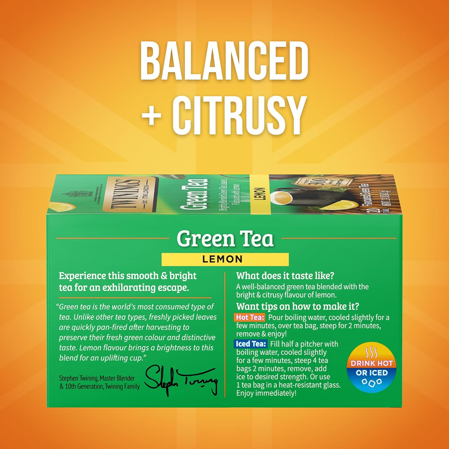 Twinings Green Tea with Lemon Individually Wrapped Bags, 20 Count (Pack of 1), Zesty Citrus Aroma & Flavour, Caffeinated, Enjoy Hot or Iced, 20 Teabags