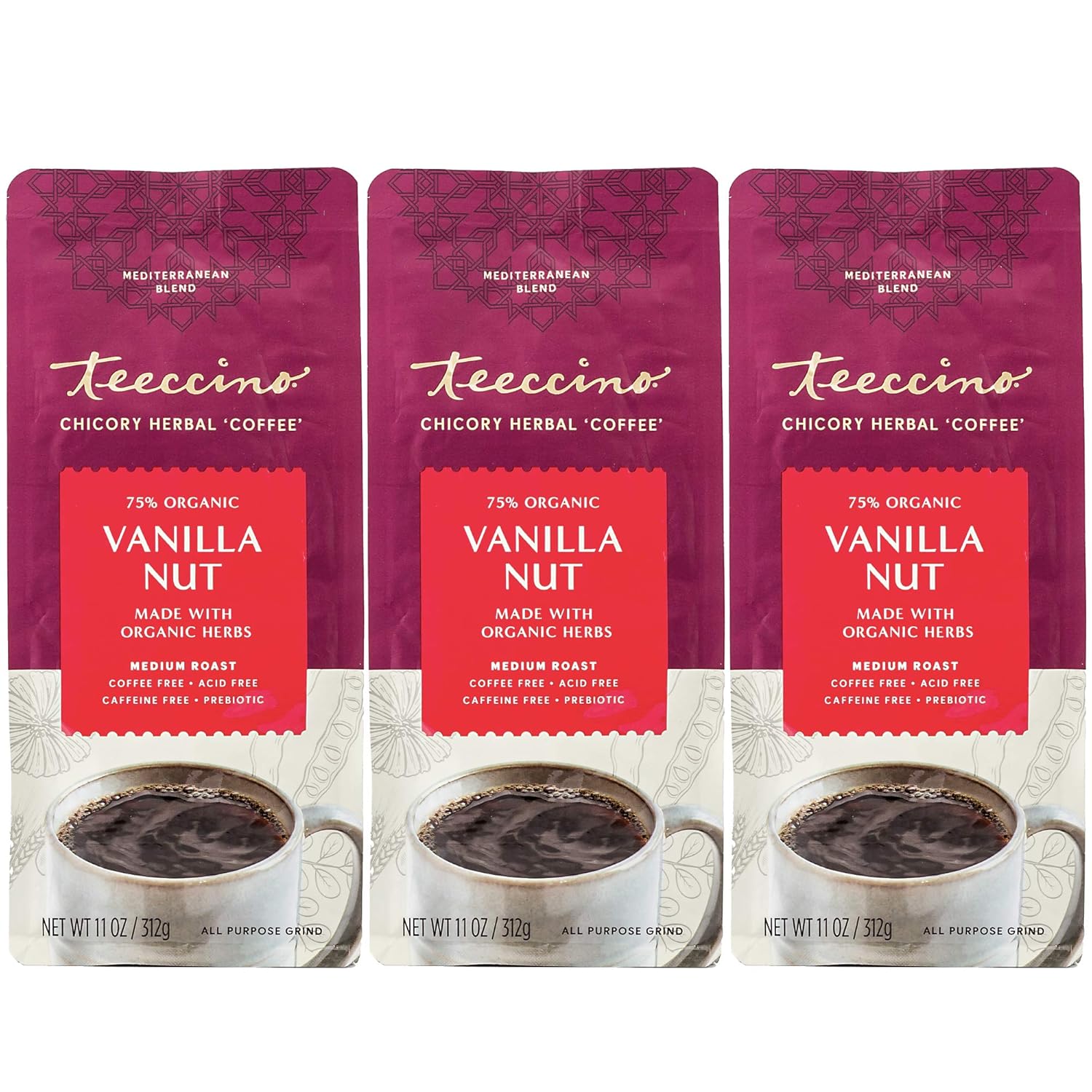 Teeccino Vanilla Nut Chicory Coffee Alternative - 11 Ounce - Ground Herbal Coffee That’s Prebiotic, Caffeine Free & Acid Free, Medium Roast, (Pack of 3)