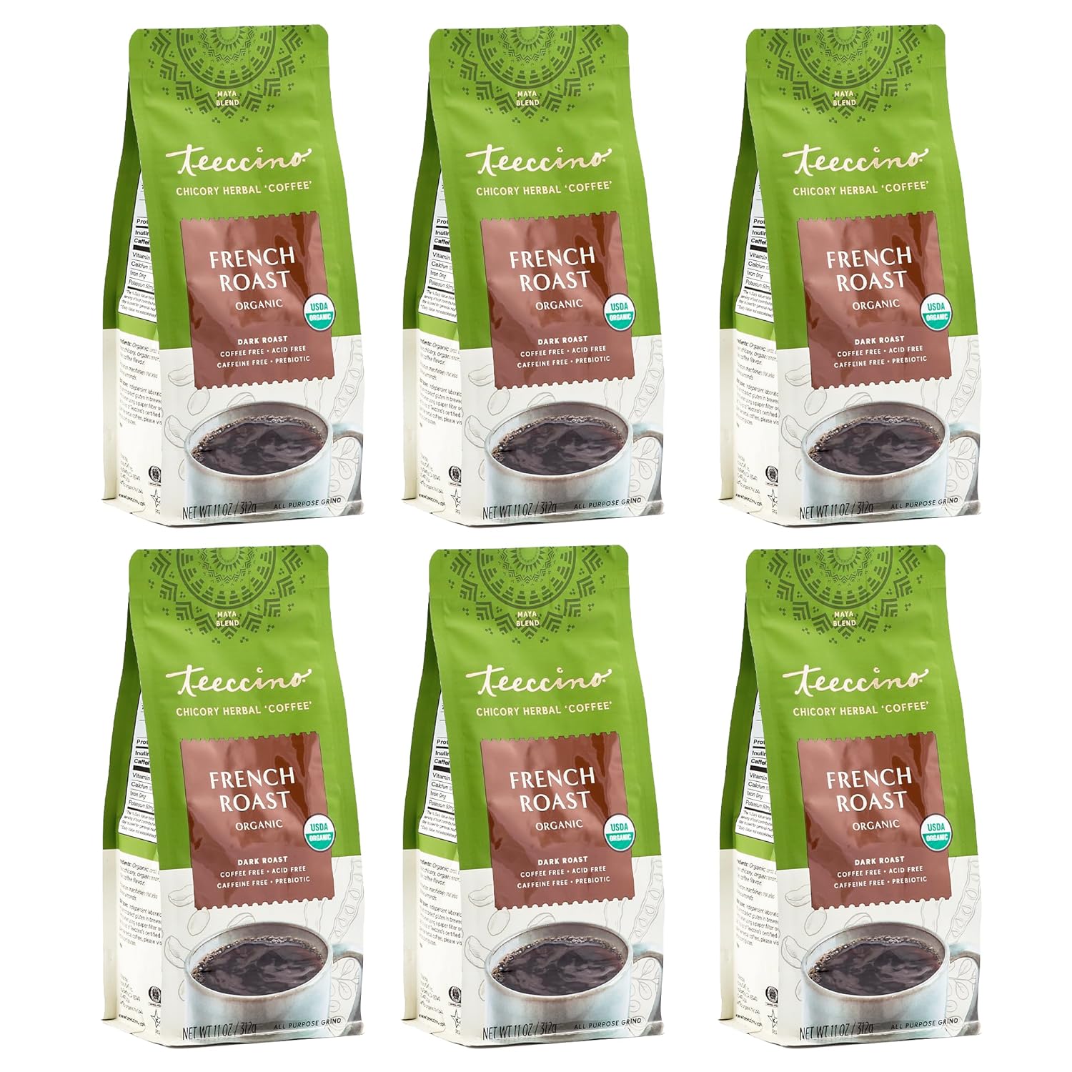 Teeccino French Roast Chicory Coffee Alternative - Ground Herbal Coffee That’s Prebiotic, Caffeine-Free & Acid Free, Dark Roast, 11 Ounce (Pack of 6)
