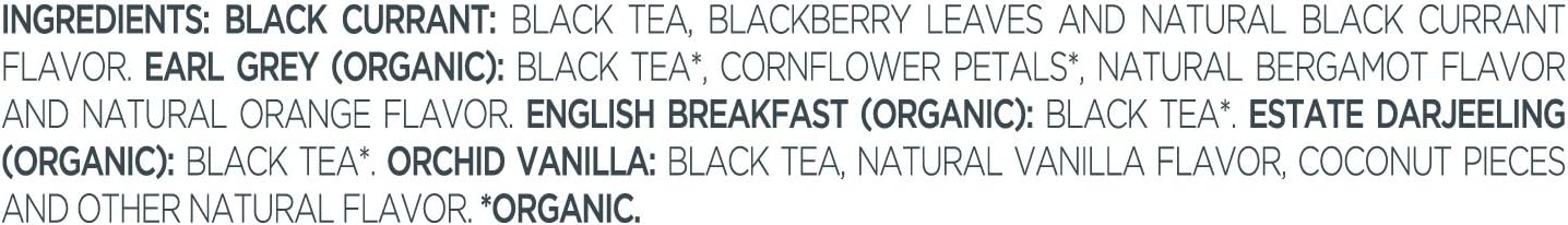 - BLACK TEA ASSORTMENT with five varieties of our most popular black tea blends - Earl Grey, English Breakfast, Estate Darjeeling, Black Currant, Orchid Vanilla.