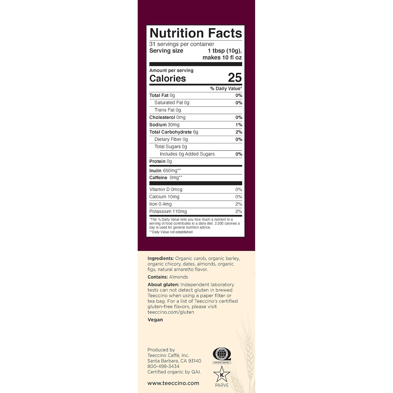 Teeccino Almond Amaretto Chicory Coffee Alternative - 11 Ounce - Ground Herbal Coffee That’s Prebiotic, Caffeine Free & Acid Free, Medium Roast