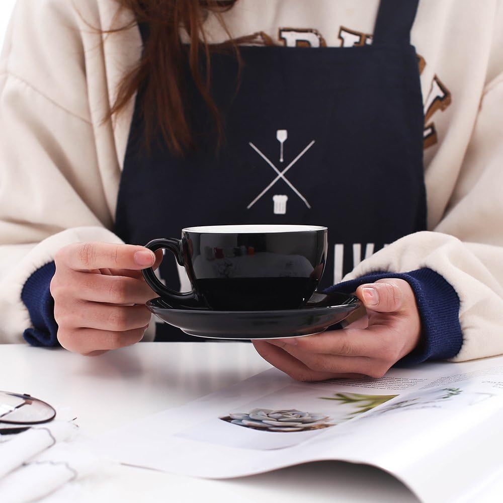 Cappuccino Barista Cup and Saucer Latte Art and Americano New Bone China for Coffee Shop (Glossy Black, 8.5 oz)
