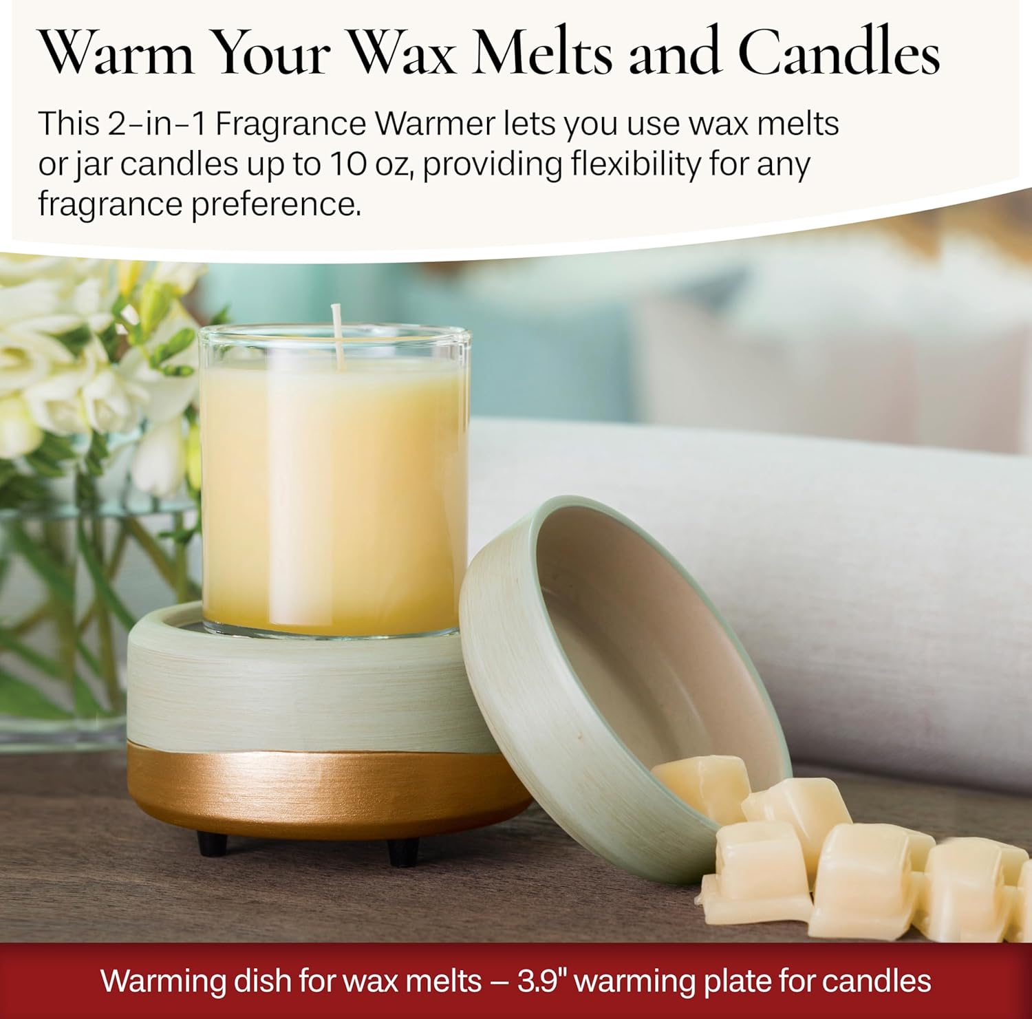 - 2-in-1 Classic Fragrance Warmers feature a versatile design that allows you to warm wax melts in the dish, or place a jar candle directly on the warming plate.