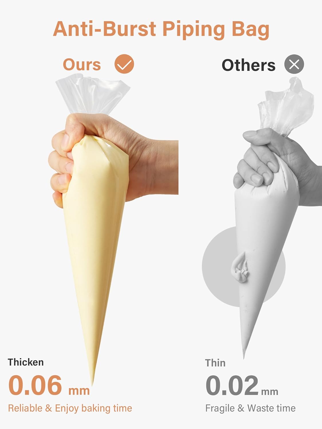 - Enhanced Durability: The 16" tipless piping bags are constructed with a thicker material, measuring 0.06mm instead of the standard 0.02mm. This increased thickness provides superior strength and durability, significantly reducing the risk of tearing or bursting even under high pressure.
