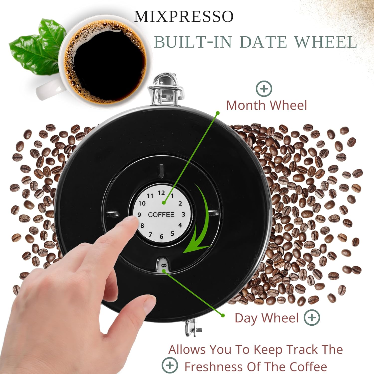- Coffee Jar with Date Tracker: This black coffee bean storage includes a built-in day/month dial to monitor freshness. Great for ground coffee, tea leaves, and dry goods with ample space.