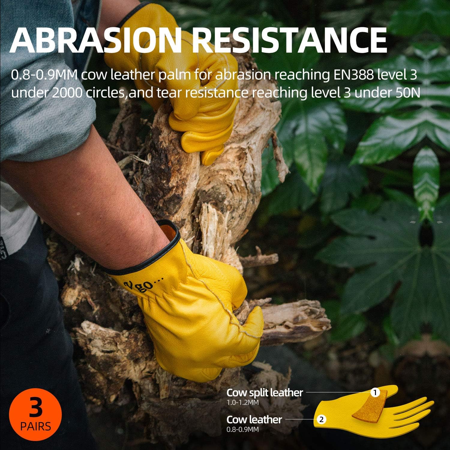 Vgo 3-Pairs Unlined Cow Grain Leather Work and Driver Gloves with Cow Split Leather Palm Patch (Size XL, Gold,CA9590)