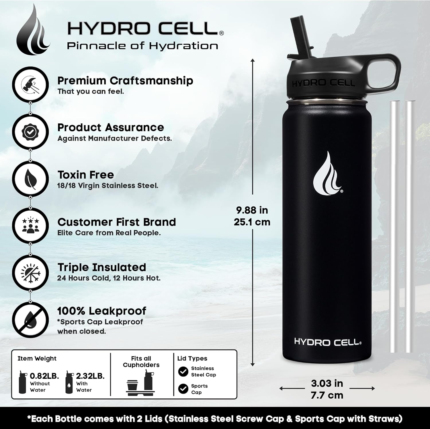 HYDRO CELL Stainless Steel Insulated Water Bottle with Straw - For Cold & Hot Drinks - Metal Vacuum Flask with Screw Cap and Modern Leakproof Sport Thermos for Adults (Black 24oz)