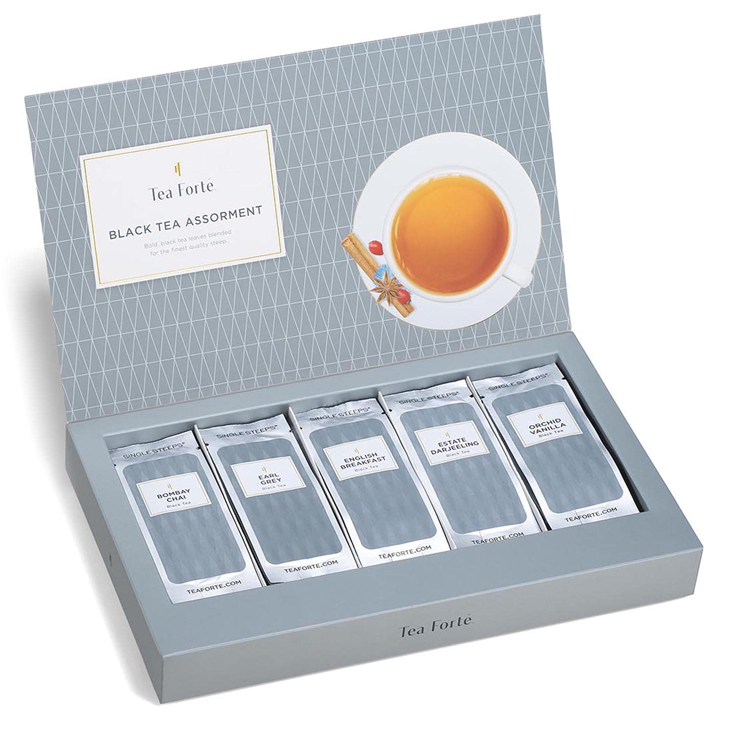 Tea Forte Black Tea Assortment Single Steeps Loose Leaf Premium Tea Gift Set Sampler, 15 Count 3 of Each Assorted Blends, Pre-Portioned Single Serve Pouches, Steeps 12 oz