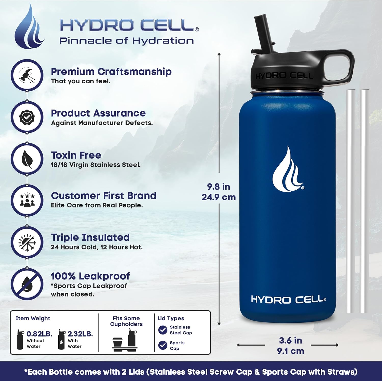 HYDRO CELL Stainless Steel Insulated Water Bottle with Straw - For Cold & Hot Drinks - Metal Vacuum Flask with Screw Cap and Modern Leakproof Sport Thermos for Adults (Navy 32oz)