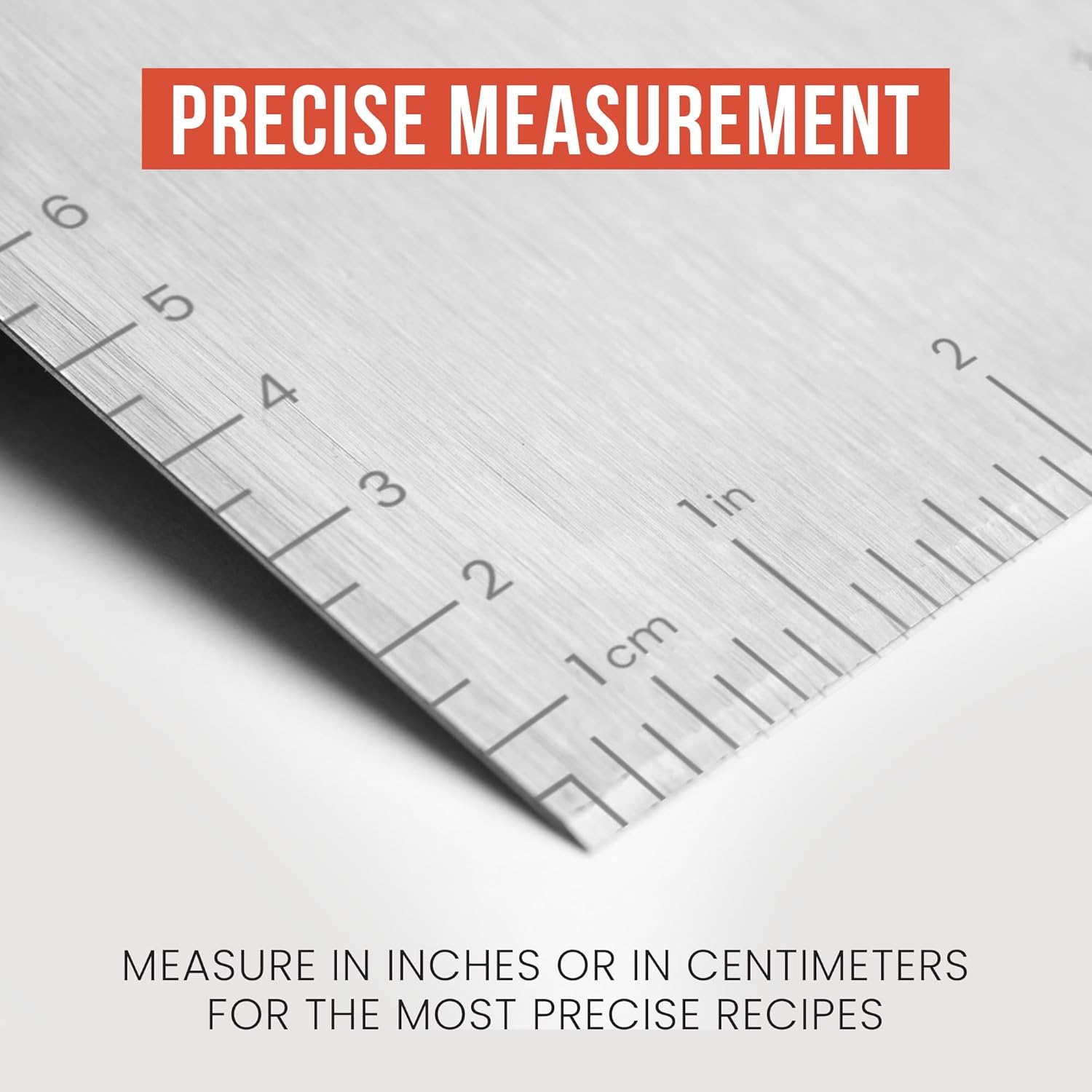 - PRECISE MEASUREMENT - Chef Pomodoro’s bench scraper measures inches and centimeters, down to millimeters! For your most precise recipes, get the best measurement tool down. Metric or imperial, get it all with Chef’s best baking tool!