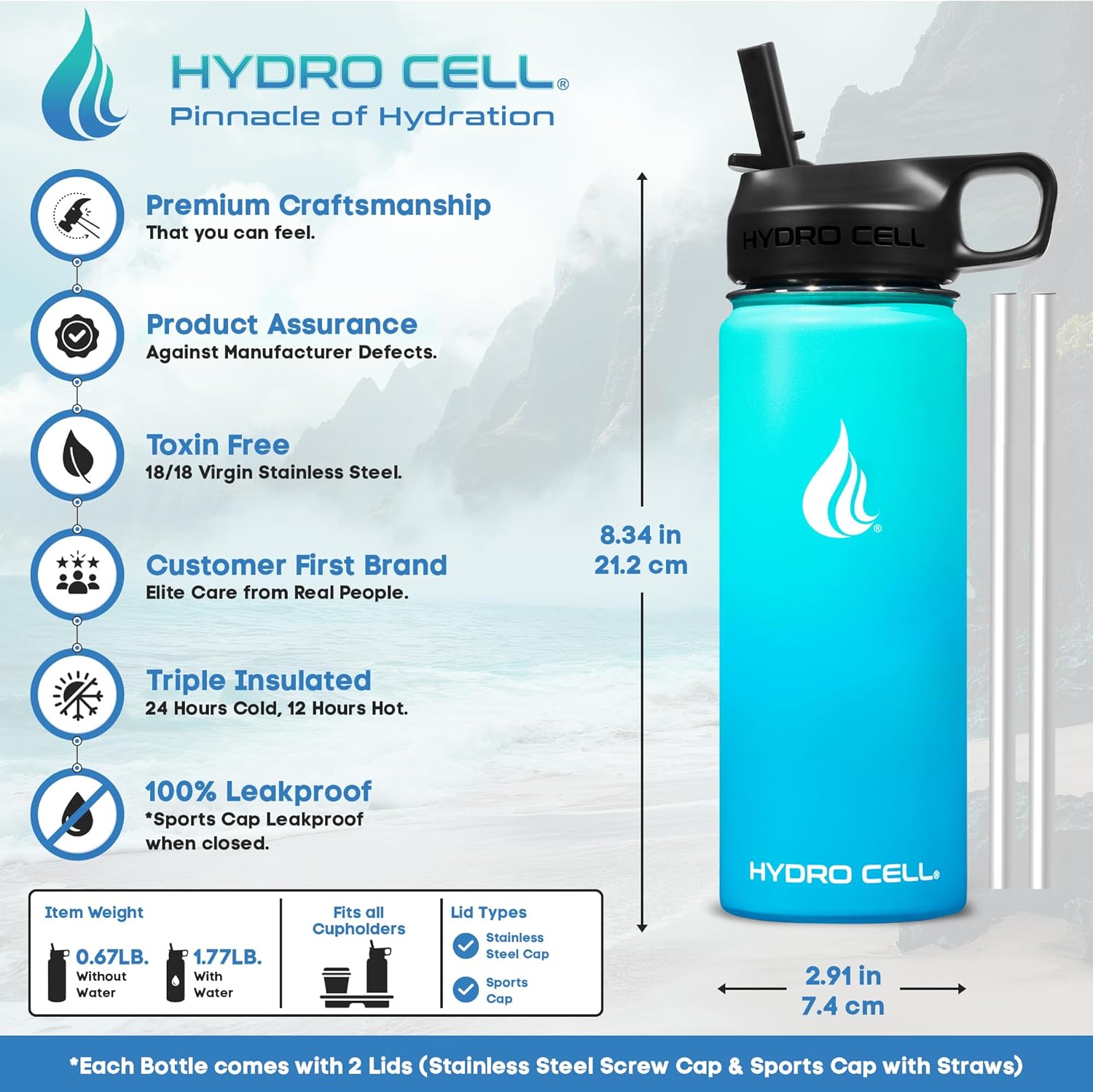 - STYLE: Purchase Includes Stainless Steel Bottle, Screw Cap (100% Airtight), Bonus Sports Cap with Straws (Cold Temp ONLY). Hydro Cell offers the largest selection of matching Paracord Handles, Bottle Boots, and Color Replacement Caps: Sold Separate, Linked Below. Customize your Hydro.