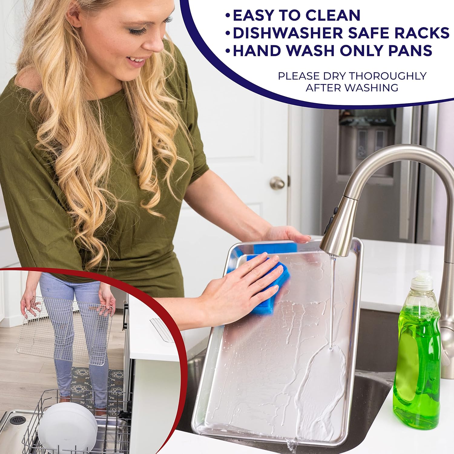 - Essential Cleaning Tip: Since the sheet pans are made of aluminum, they are NOT dishwasher safe. Let the pans cool a bit after use, then soak in warm, soapy water for 4 hours to get rid of tough stains.