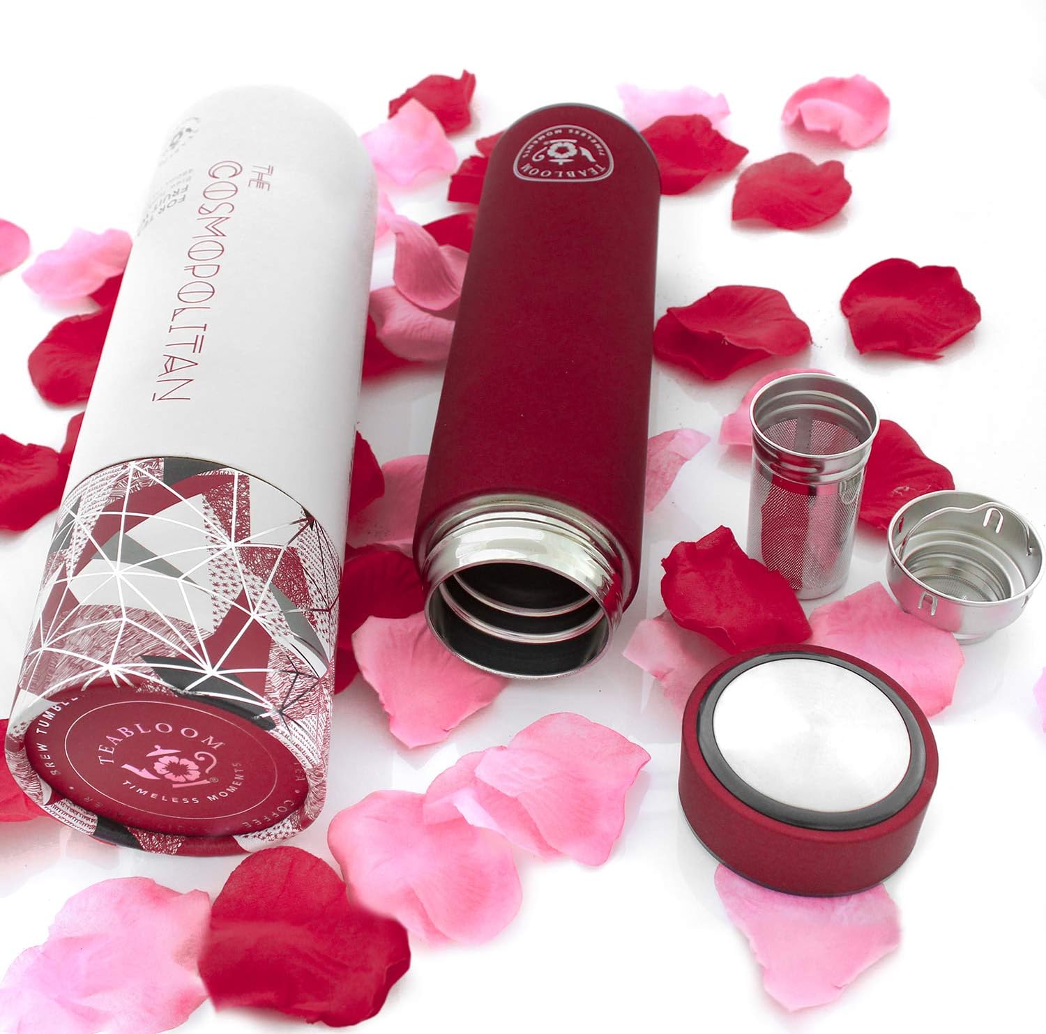Teabloom ORIGINAL All-Purpose Beverage Tumbler - 16 oz - 480 ml - Brushed Metal Insulated Water Bottle/Tea Flask/Cold Brew Coffee Mug - Extra-Fine Two-Way Infuser Travel Bottle - Ruby Red