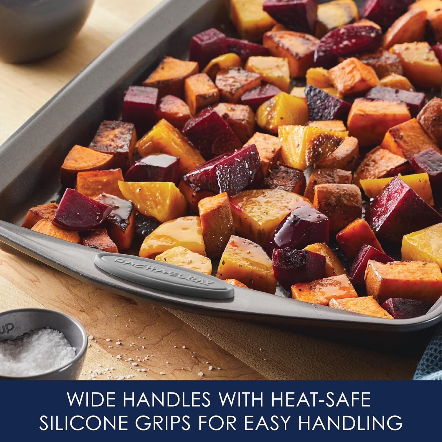 - GET A GRIP: Bold-colored, extra-wide grippy handles on the pans provide a confident grasp and are oven safe to 500 degrees F
