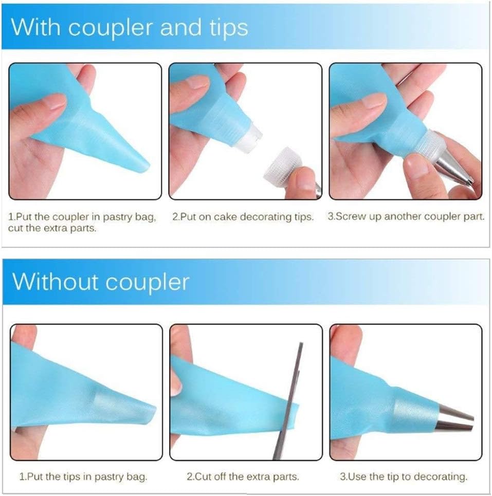 - 【Accessories】: Silicone icing bags set includ 10pcs 18 inch piping bags,10 decorating bags ties, 6 small piping tips couplers,2 ball tips couplers (purple) and 2 russian tips couplers (green).