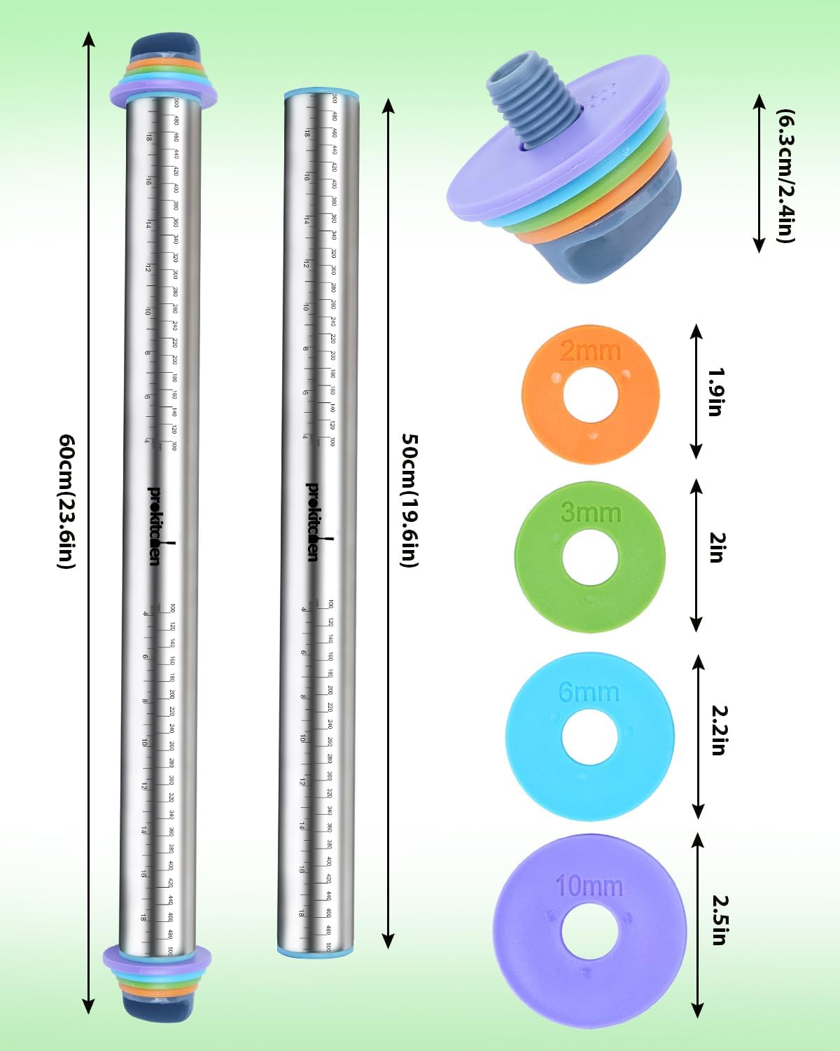 - Extended Length for Larger Dough Sizes---This stainless long adjustable rolling pin with thickness for baking rings measures 23.6in long, great for rolling out large pieces of dough or fondant. The adjustable rolling pin with thickness rings is long enough so that the ring at the end will not cut the dough when rolling. No matter how big the dough is, you can roll it out easily. The extra length can speed up your work in the kitchen