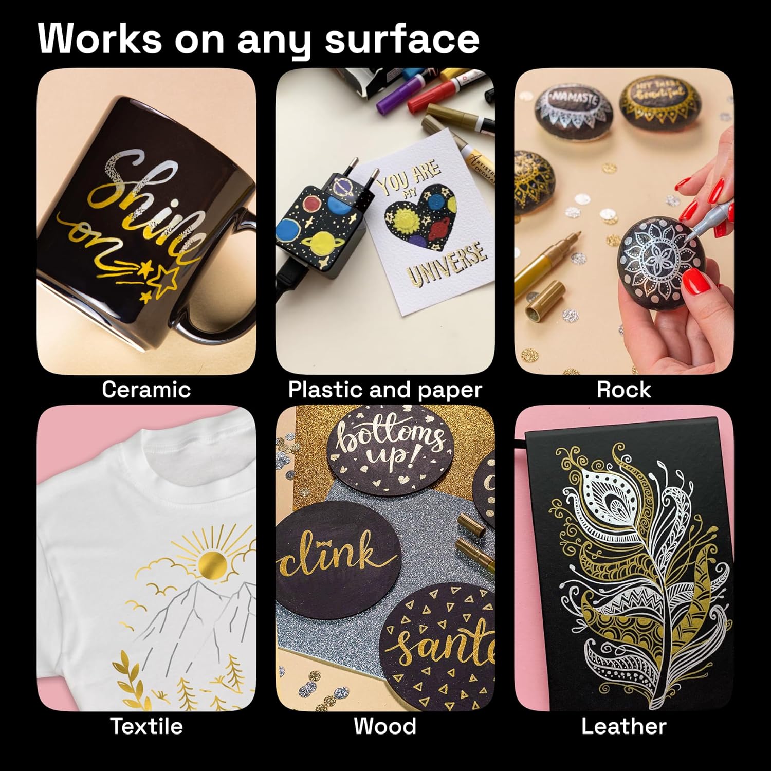 - Any Surface: Use as a tire ink paint pen for car tires, fabric paint pens for clothes permanent, or as permanent paint markers for plastic and glass. Draw with a gold leafing pen on stone, rock, porcelain, wood, ceramics, etc.