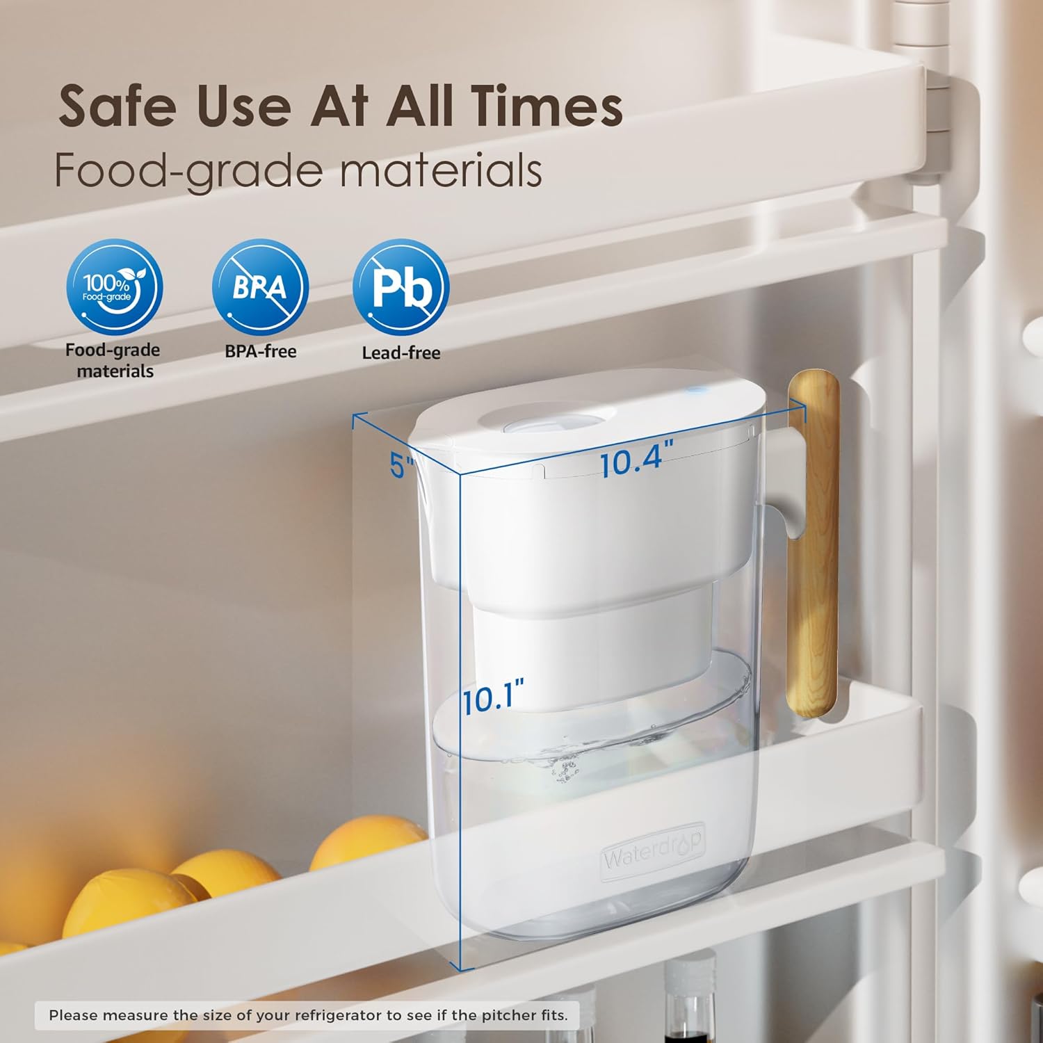 - Natural wood, Fashion choice: The natural wood handle of the water filter pitcher with lid meets the ergonomics design. The Waterdrop filtered water pitcher can be put on one side door of most refrigerator. Product Dimensions: 10.4"*5"*10.1". Please measure your fridge to ensure it fits.