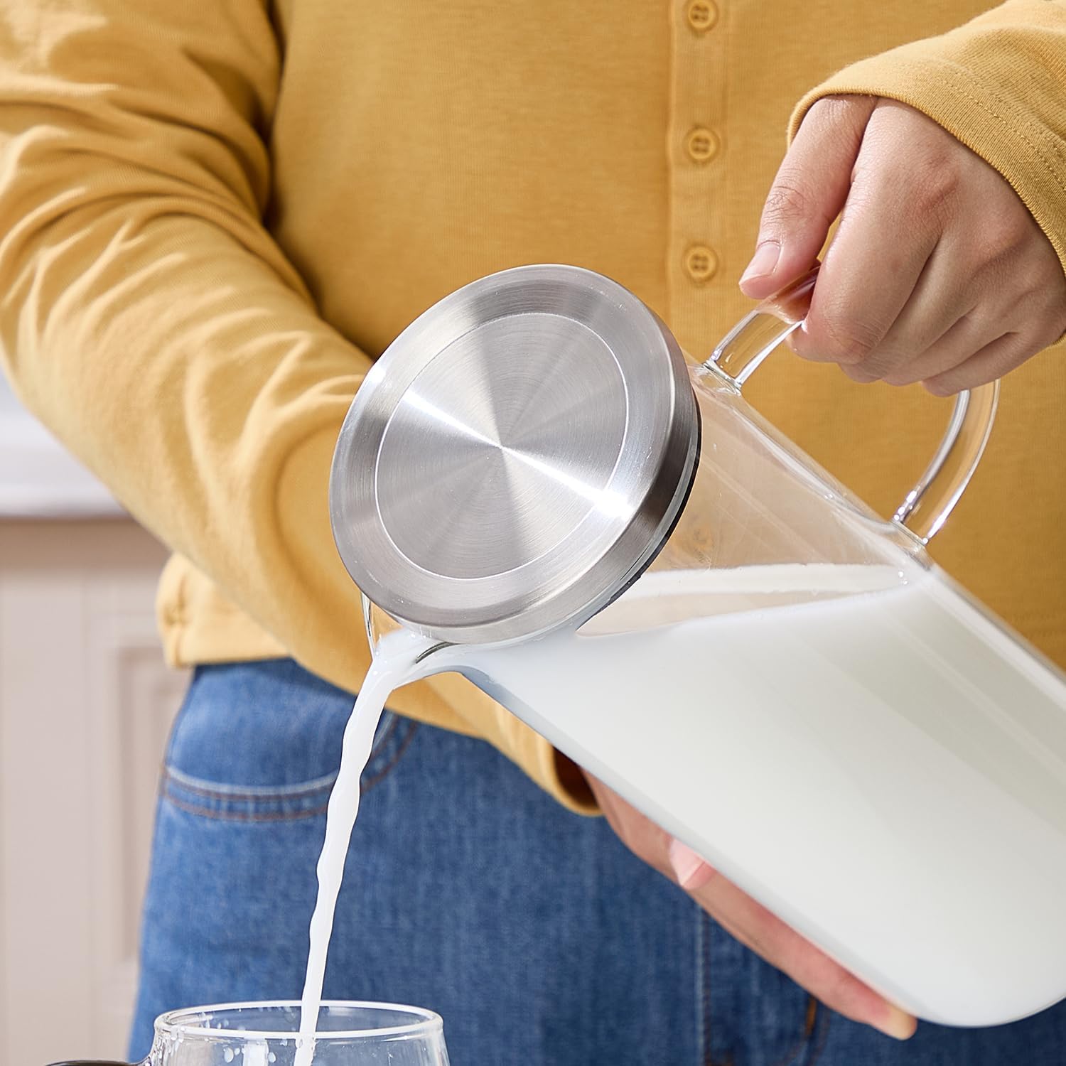 - [Glass Pitcher Capacity] With a 50-ounce high capacity, this pitcher is suitable for a wide range of beverages and has enough to serve your family and friends. It fits well in most refrigerators and is ideal for preparing and serving cold or hot beverages, such as water, iced tea, fruit-infused juices, etc.