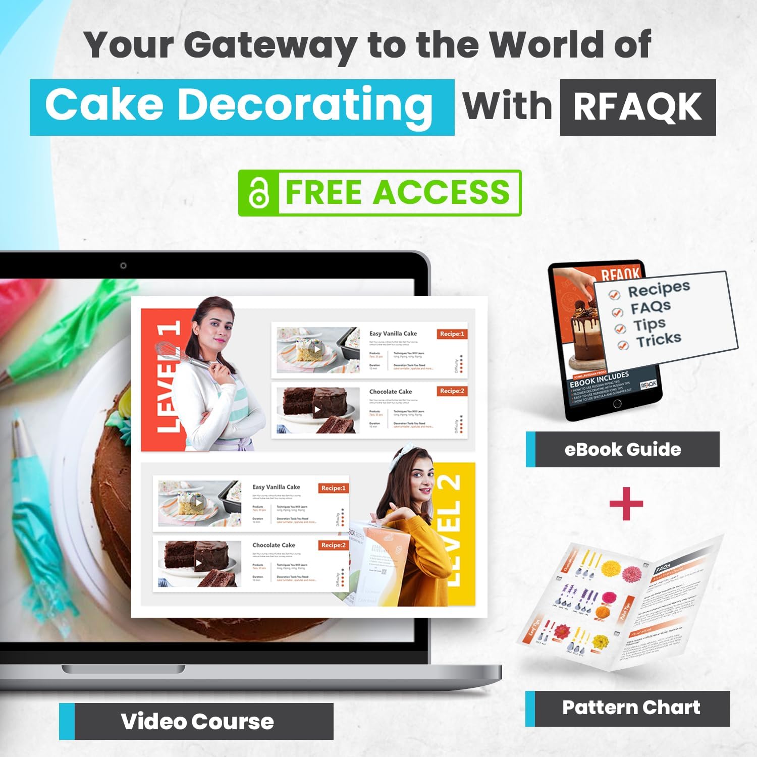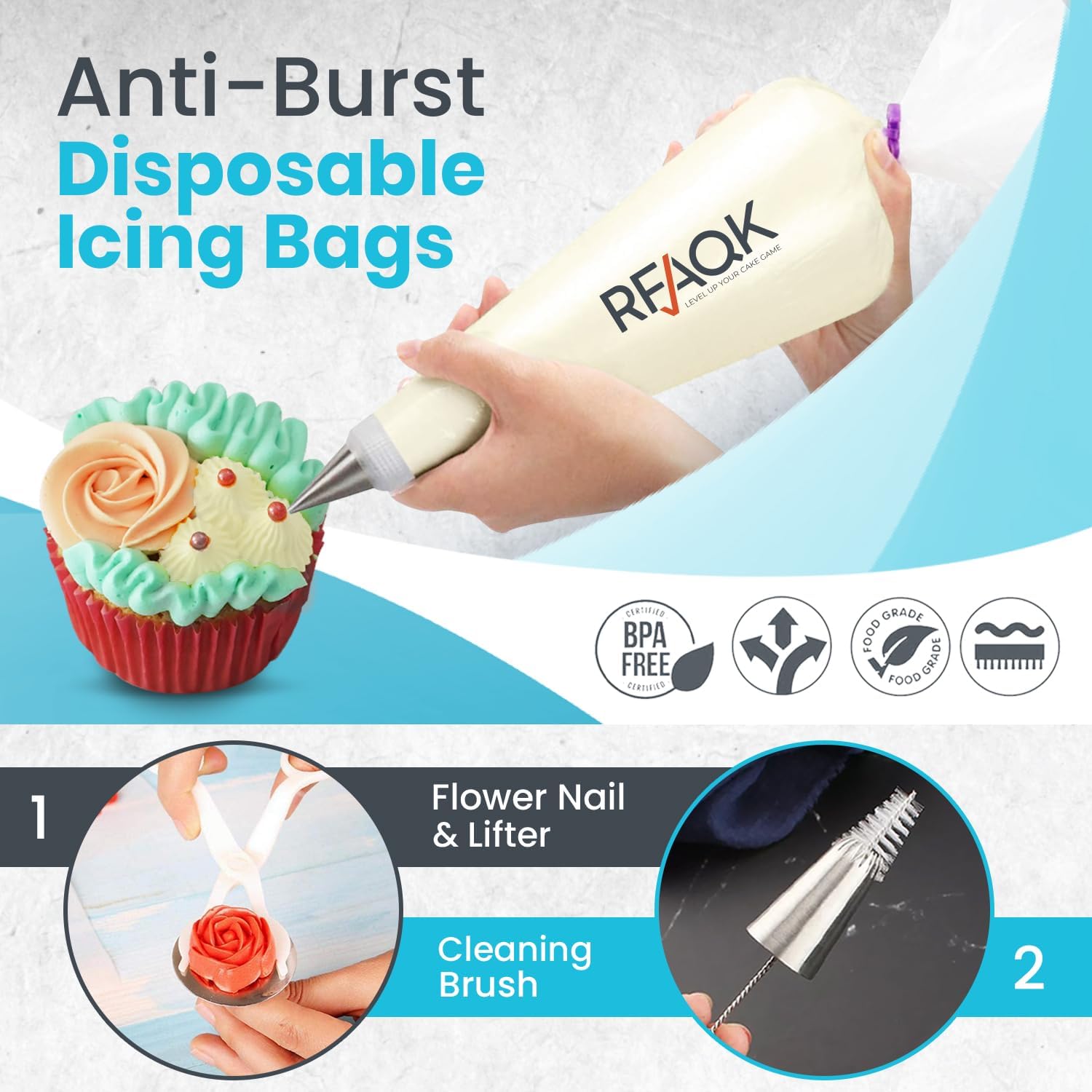- Essential Cake Decorating Tools: Getting ready to decorate but not sure what tools you need? RFAQK offers complete baking supplies set that includes everything you need to start decorating Cakes like a PRO! 48 Numbered Easy to Use icing tips with E-Book in PDF (User Guide for beginners) & Booklet showing outcome of each Icing Nozzle, 2 Coupler, 20 disposable icing bags, 1 Reusable pastry bag, 1 Flower nail & lifter, Cleaning brush, Storage box that keeps everything organized