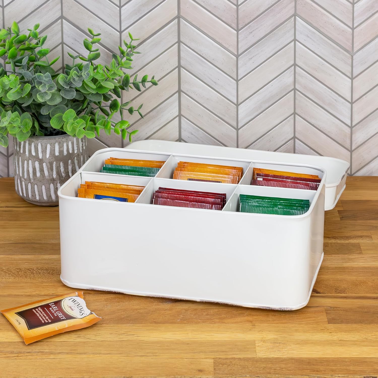 - SIZE: 9.25 inches long x 5.5 inches wide by 3.5 inches tall; sections are approx. 3 x 2.5 inches by 3 inches deep for 15 individually packaged or 20 loose tea bags each