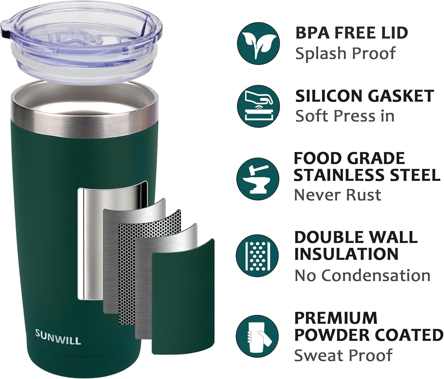 SUNWILL Travel Coffee Tumbler 20 oz, Insulated Mug with Lid, Stainless Steel Cup for Outdoor, Powder Coated Dark Green