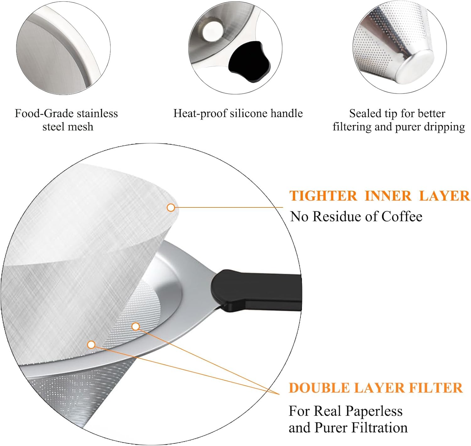 Pour Over Coffee Filter 2PCS, Stainless Steel Coffee Filter, Paperless Reusable Cone Coffee Dripper