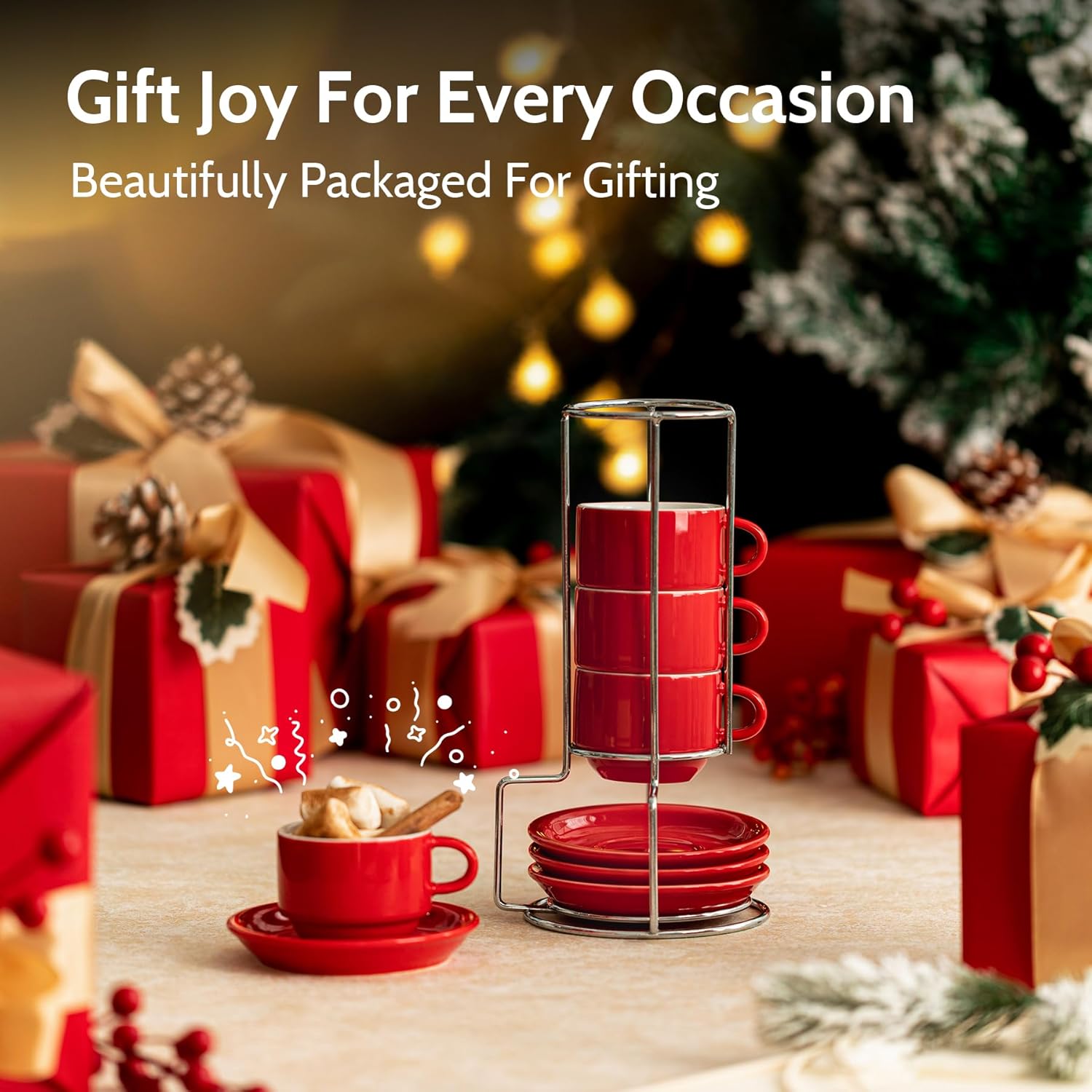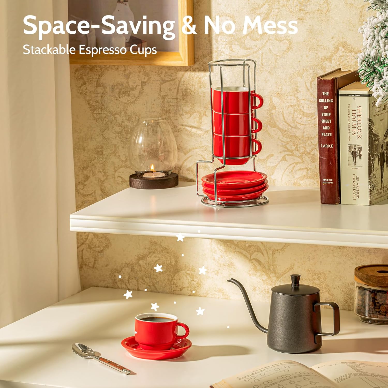 Sweese 4 Ounce Porcelain Stackable Espresso Cups with Saucers and Metal Stand Set of 4, Red