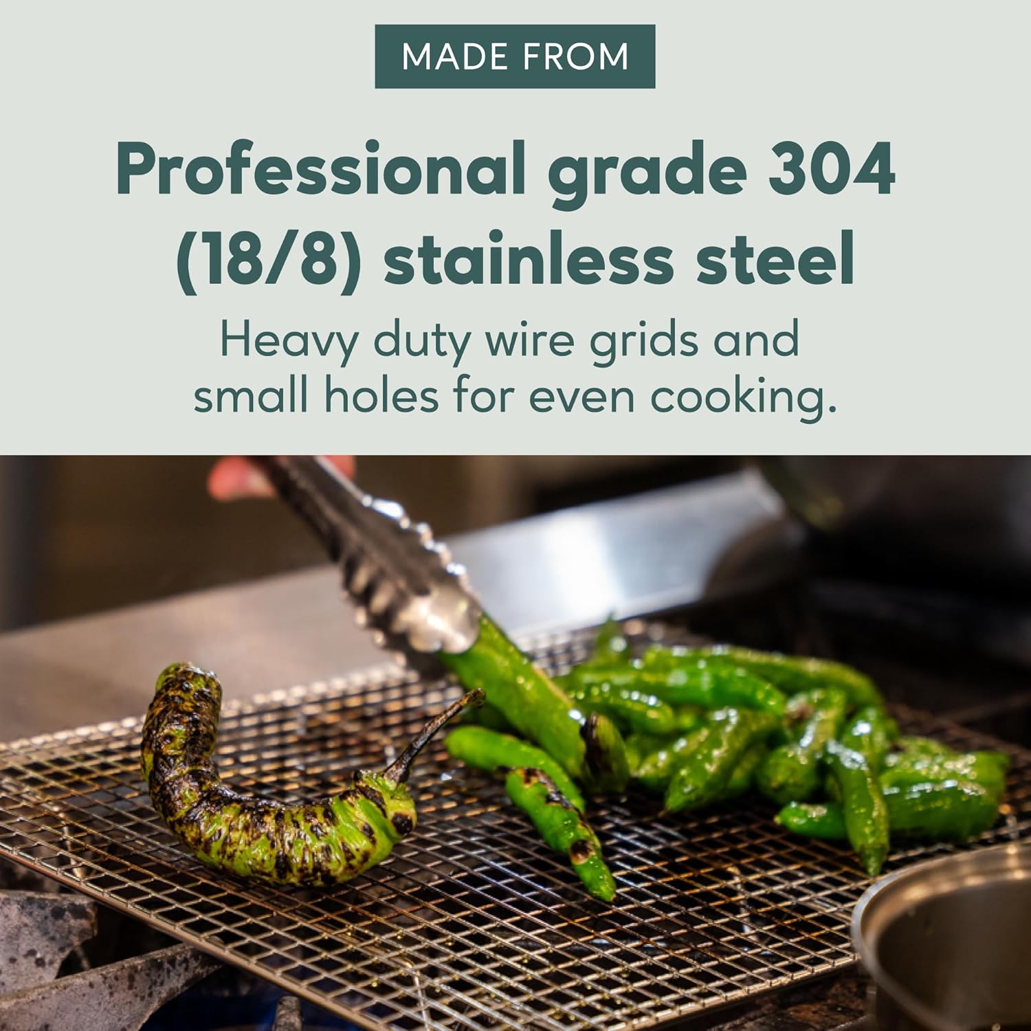 - HEAVY DUTY STAINLESS STEEL, STURDY DESIGN: Set of 2 cooling racks for jelly roll baking pans are food-safe, professional grade 304 (18/8) stainless steel with strong, heavy duty wire grid, small holes, smooth no-snag edges, and a full 1 inch height resulting in greater all around airflow for even cooking, cooling and roasting every time!