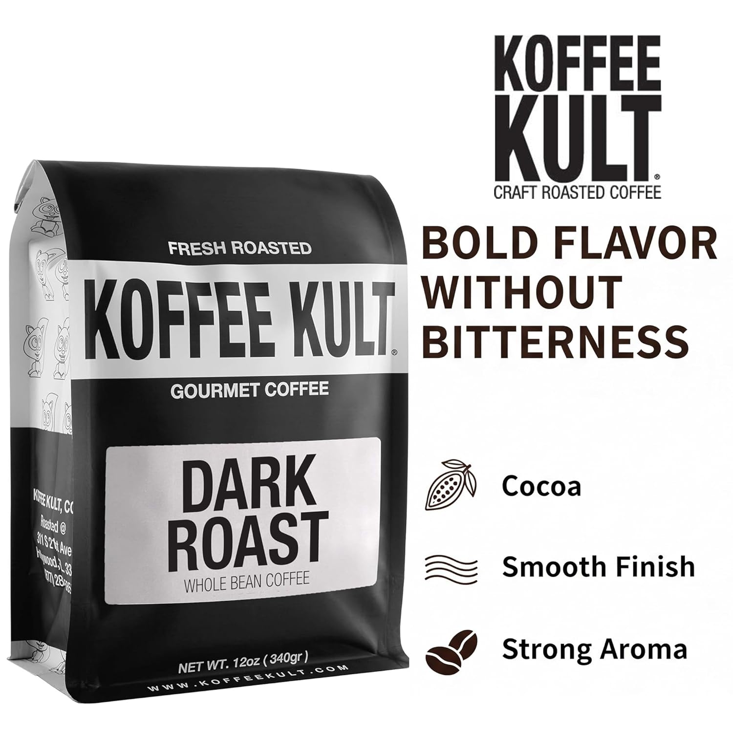Koffee Kult Dark Roast Coffee Beans - Rich & Bold with Chocolate & Cinnamon Notes, Smooth Finish 100% Arabica, Ethically Sourced Resealable 12oz package