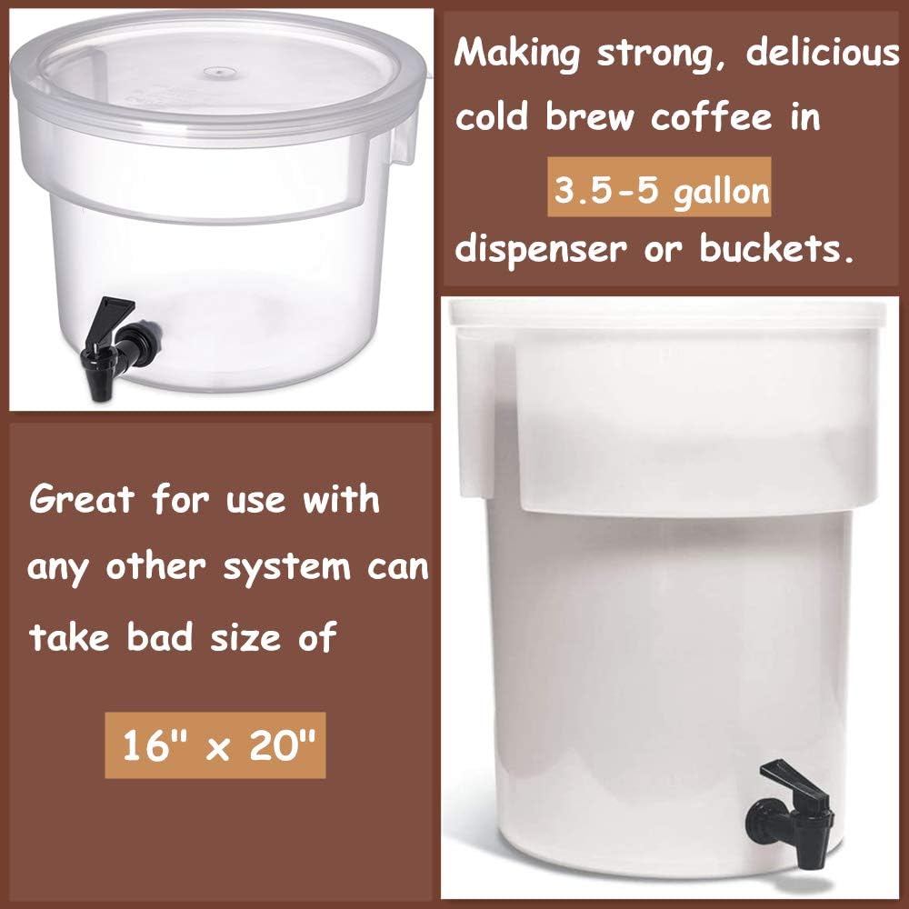 - COMMERCIAL SIZE FILTER BAGS - (100 count) Each brewing bag at 16" Wide x 20" Tall, stronger enough it can holds up to 14 lbs of wet ground coffee for making strong, delicious cold press in 3.5- 5 gallon ( or larger) dispenser and buckets as well as commercial cold brew systems. (Tips: We recommend buckets with spigot and use coarse ground coffee.) Brew a batch and keep it in the fridge for any commercial settings, such as: events, wedding, birthday party, cafes and coffee shops.
