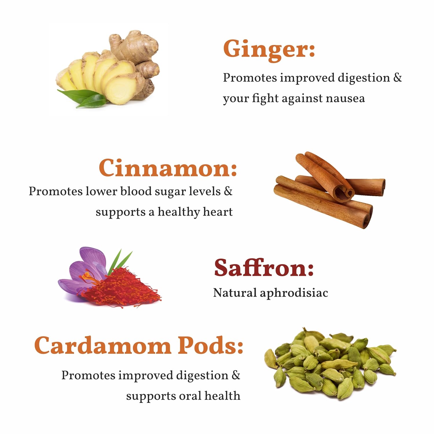 - ✨ Aromatic & Full Bodied – Bold Assam tea balanced with warm saffron notes & creamy spices.