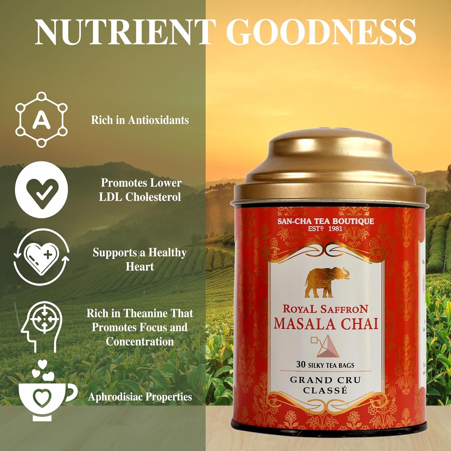 Sancha Tea Boutique Royal Saffron Chai | 30 Pyramid Bags | Masala Chai with Real Kashmiri Saffron & Premium Assam Tea | India’s Famous Spiced Tea