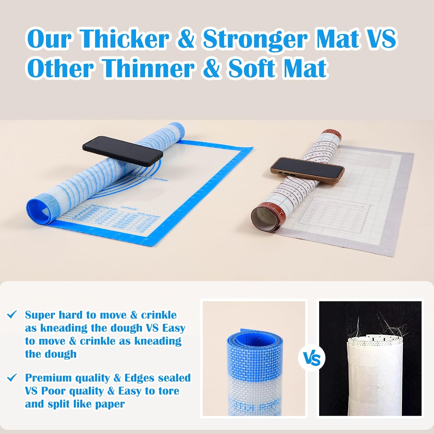 - A Level Up Pastry Mat:The thickness of the mat is 0.7MM.The thickness of the silicone pad is almost twice as thick as the others(0.4MM).The 0.7MM mat will stay good on the table and not wrinkle when used.And it is also much durable.