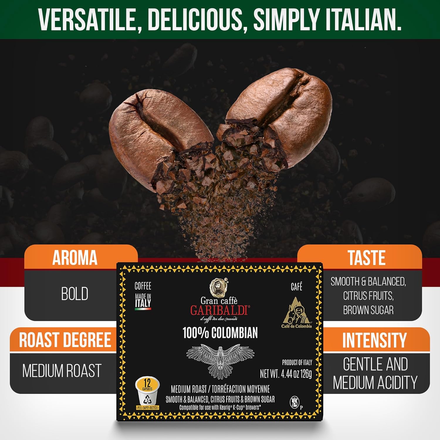 Caffè Garibaldi Colombian Coffee Pods, for Keurig K-Cup Brewers, Single Serve Cups with 100% Arabica Blend for Coffee Makers, 12 Count Recyclable Pods - Medium Roast