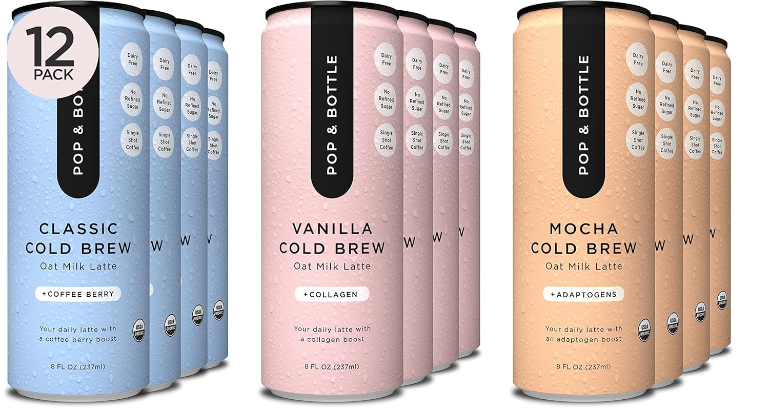 - CANNED COFFEE DRINKS - Pop and Bottle oat milk latte drinks are crafted to help jumpstart your day with organic ingredients & supplements to keep you going while at home or on the go