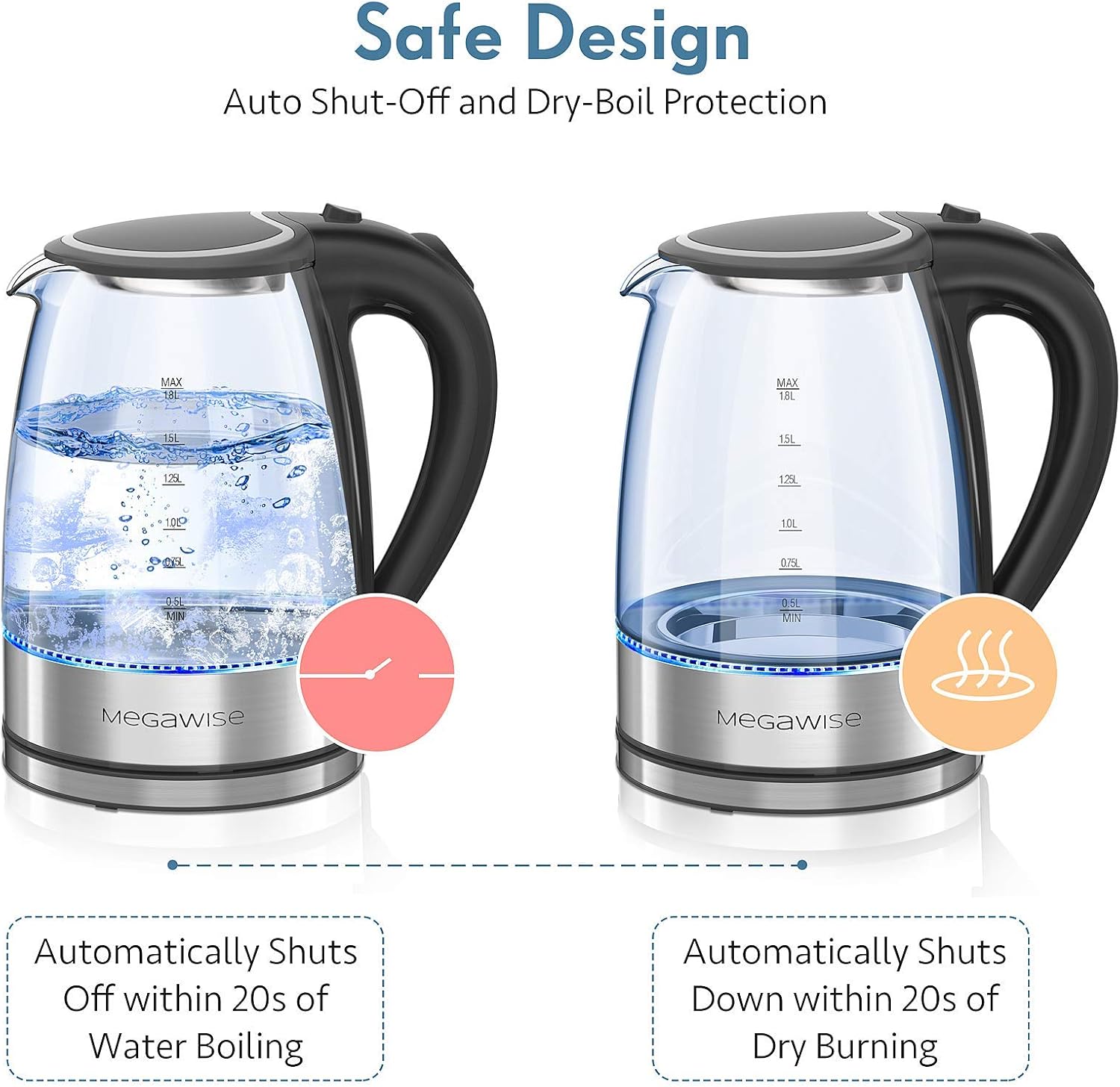 MegaWise Electric Kettle, 1.8L Borosilicate Glass Tea Kettle with LED Light, Auto Shut-Off and Boil-Dry Protection Cordless Kettle Fast Boiling