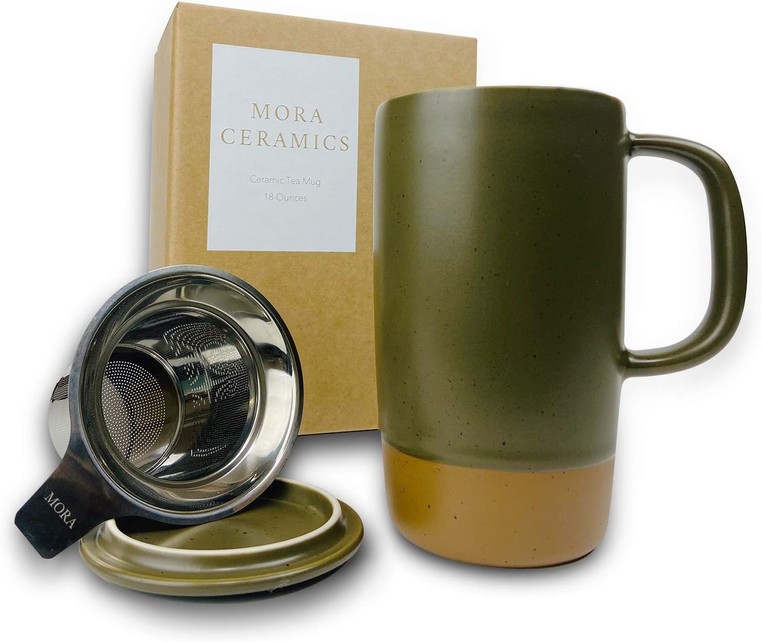 Mora Ceramics Large Tea Mug with Loose Leaf Infuser and Ceramic Lid, 18 oz, Portable, Microwave and Dishwasher Safe, Tall Coffee Cup - Rustic Matte Ceramic Glaze, Modern Herbal Tea Strainer, Olive