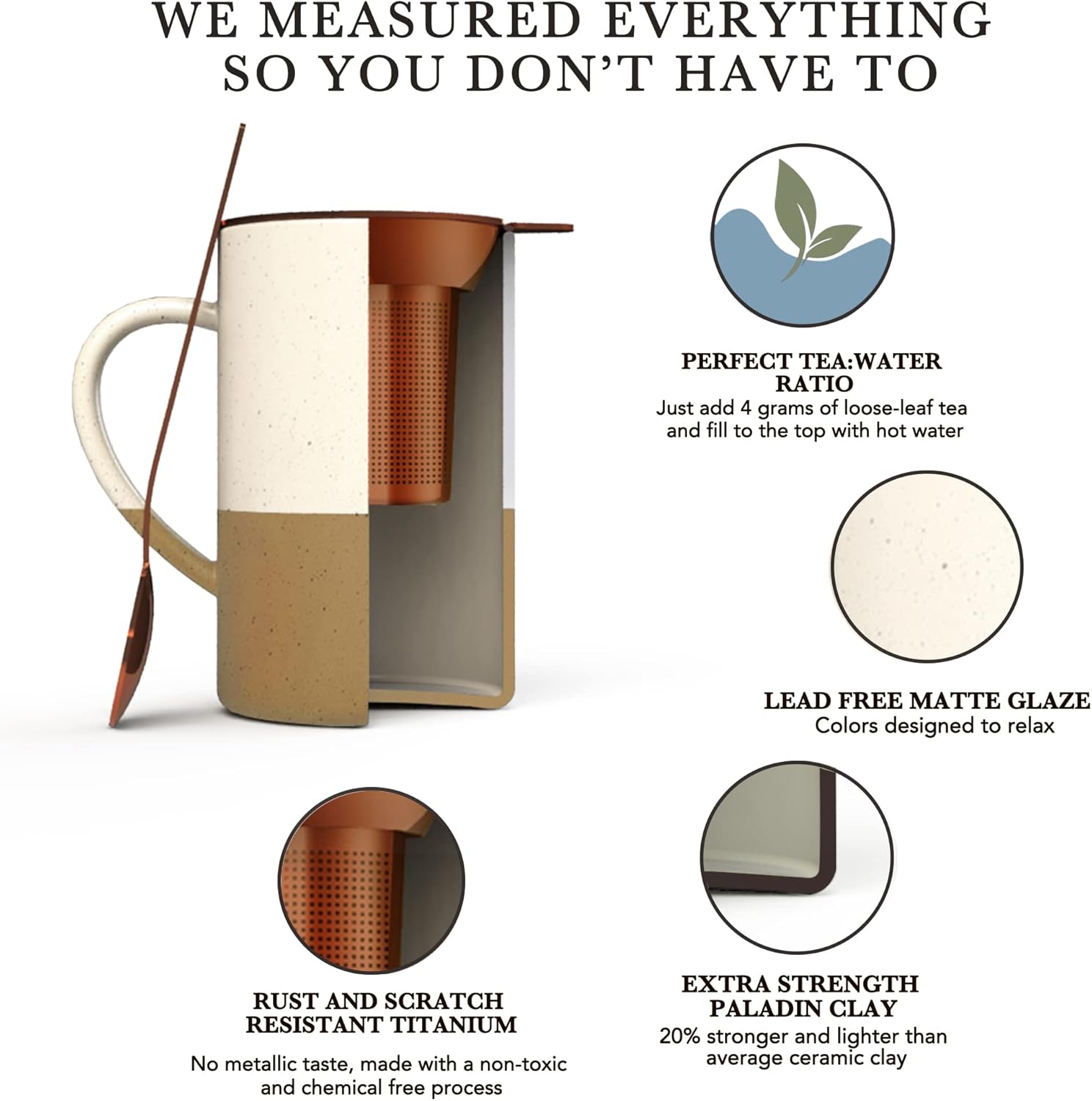 - TITANIUM COATED TEA FILTER AND SPOON: Our stainless steel tea infuser and spoon are coated with titanium for an anti-erosion finish. Instead of using chemical plating, we use a pressurized vacuum-coating so there are zero chemicals used in the process. Please note that vacuum-coating may result in the inside part of the infuser not having as bright of a copper color as the outside, since it is pressurized from the outside wall-in. All our materials are food grade, beautiful, and lightweight.