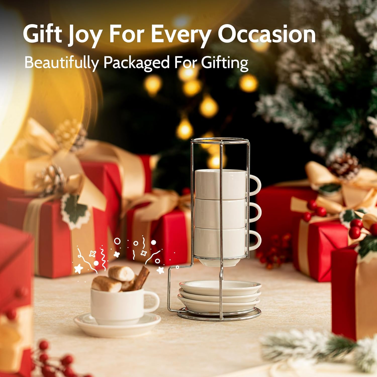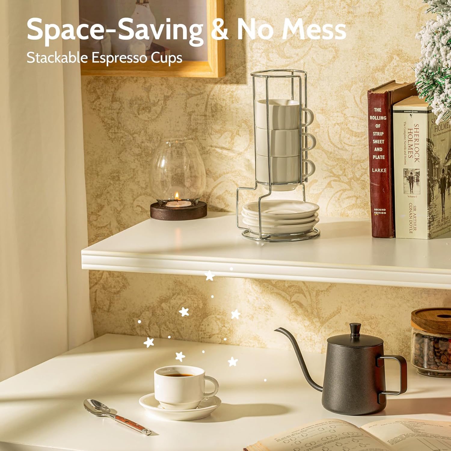 Sweese 2.5 Ounce Porcelain Stackable Espresso Cups with Saucers and Metal Stand Set of 4, White