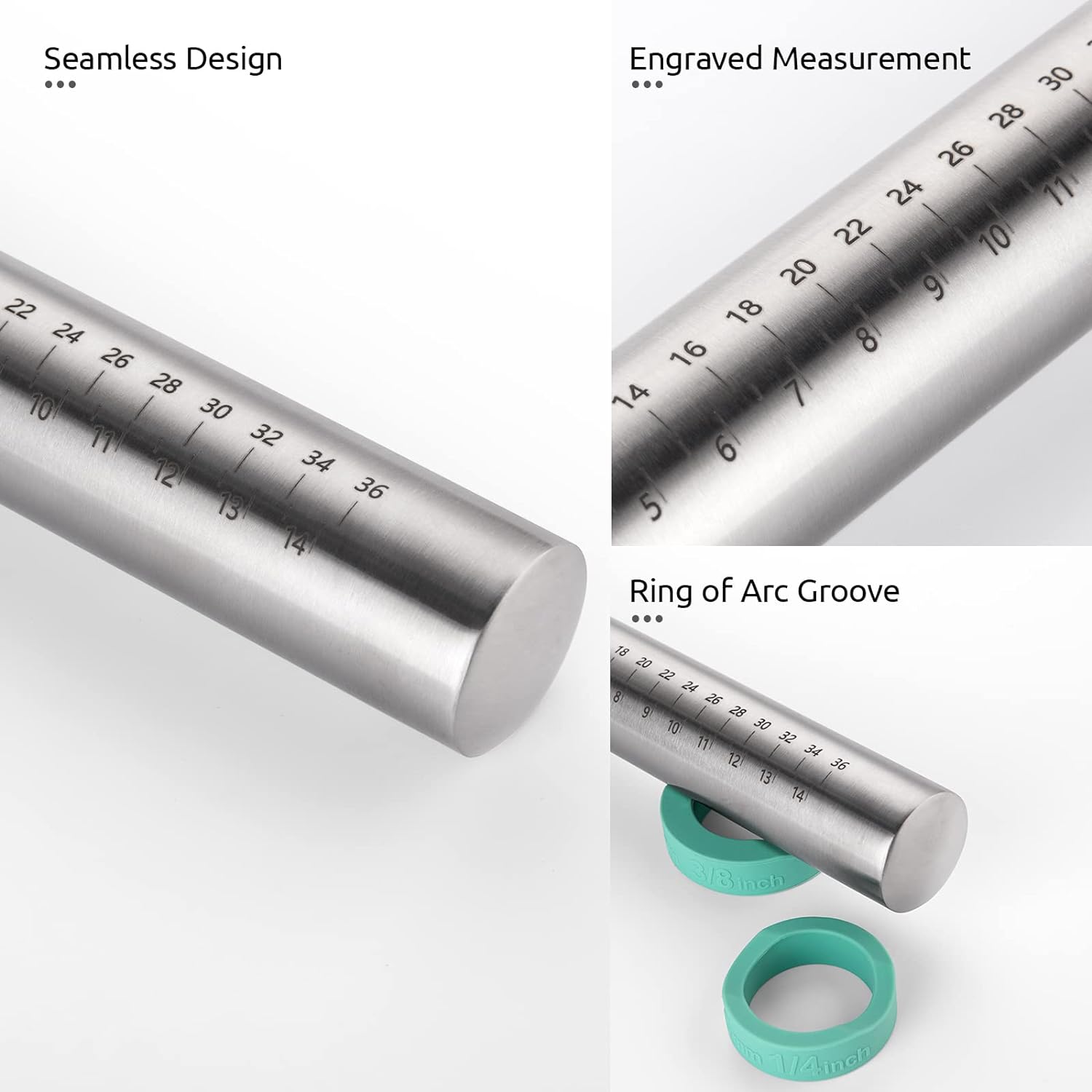 - [Engraved Measurement and Seamless Design] Easy to read with clear engraved measurement on it and never wash off over time. You can roll the dough whatever the size you need. The integrated seamless design makes sure that the water will not seep into the rolling pin. The 16in length is suitable for nearly all baking tasks. You can leave them in the fridge to keep it cool and nonstick to roll out your dough. A great gift for the bakers to make tortellini, pasta, pie crust, pizza dough and cookies.