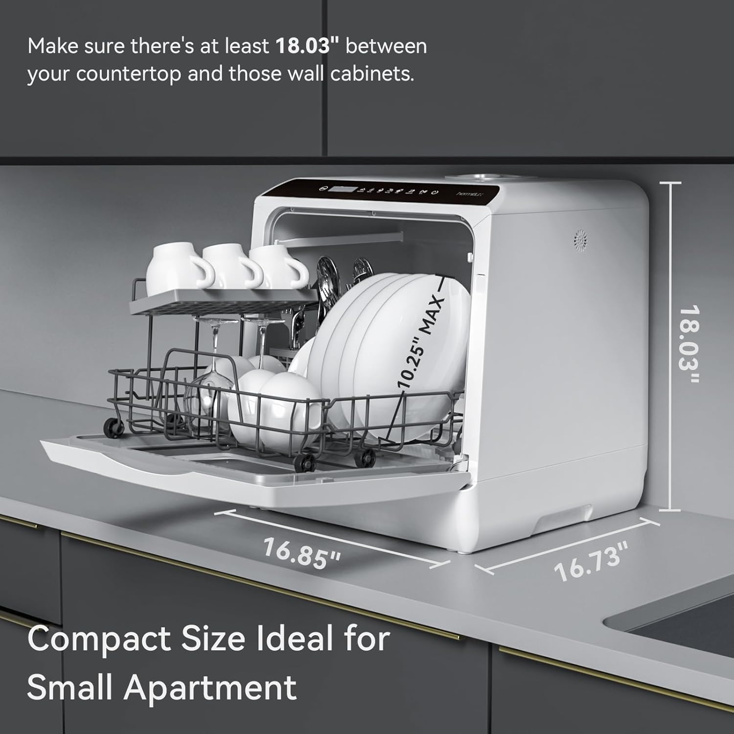 - 【PERFECT WASH】No more washing dirty dishes by hand every day. hermitlux Countertop Dishwasher increases the convenience of your life, even if the space is small, it can be placed in your kitchen. Make sure there's at least 19.88" between your countertop and those wall cabinets.