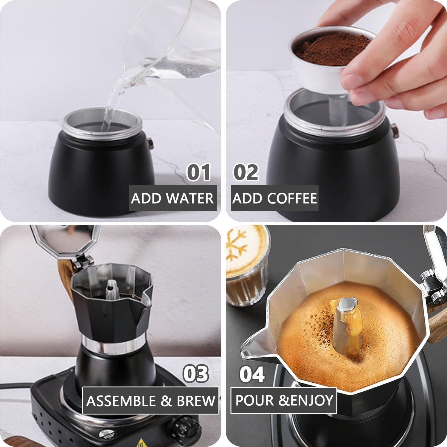 - 【𝗦𝗮𝗳𝗲 & 𝗛𝗮𝘀𝘀𝗹𝗲 𝗙𝗿𝗲𝗲】 Our aluminum espresso maker made with durable aluminum that keeps coffee warm. With Cool Touch Handle and and safety valve to release excess steam for easy handling
