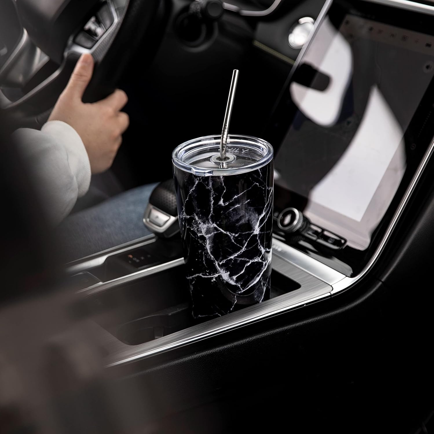THILY Stainless Steel Vacuum Insulated Tumbler Travel Mug 26 oz Coffee Cup with 2 Lids and Straws, Splash Proof, Keep Ice Drinks Cold, Black Marble