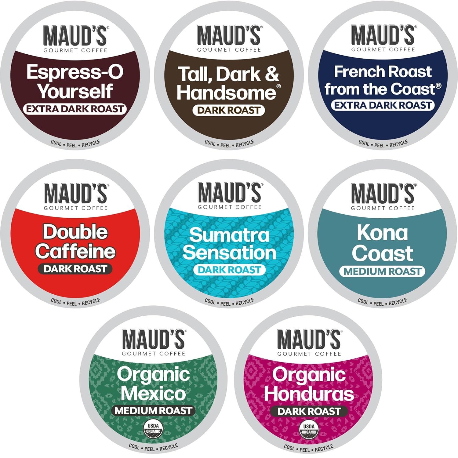 - [Bold & Dark Roast Coffee Variety Pack ]: Indulge in Maud's Bold Roast Coffee Variety Pack, featuring 8 gourmet dark roast blends. Explore Tall Dark & Handsome, Double Caff, Espresso, Kona, Sumatra, French Roast, Organic Honduran, and Organic Mexican. Uncover your favorites in this exclusive dark roast variety pack!