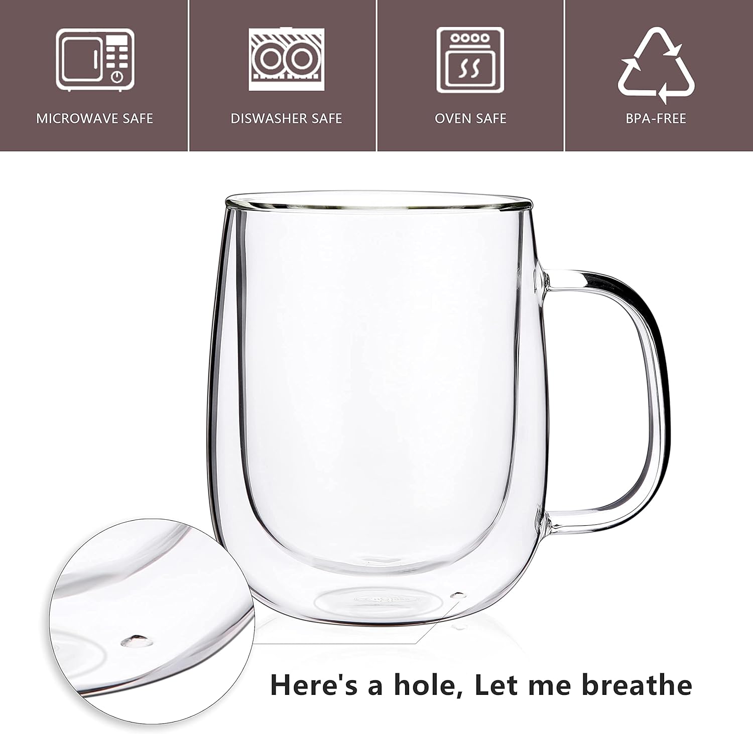 CNGLASS Glass Coffee Mugs 12oz,Double Wall Insulated Mug Set with Handle,Clear Glass Espresso Mugs for Latte,Cappuccino,Tea Bag,Hot and Cold Beverages,Set of 2